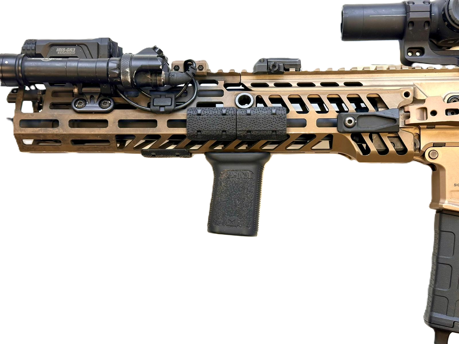 Die Niedrigprofil-Länge optimiert die Mobilität und minimiert das Risiko des Verfangens. Der Vorwärtswinkel verstärkt die Steifigkeit des Unterarms und gewährleistet gleichzeitig einen ergonomischeren Handgelenkwinkel. Die Montage im umgekehrten Winkel ermöglicht eine verbesserte Kontrolle beim Greifen des Handguards und des Griffs. Flache Seiten mit einer aggressiven Textur bieten dem Schützen sowohl während des Schießens als auch bei nicht schießenden Manipulationen eine überlegene Gierkontrolle.